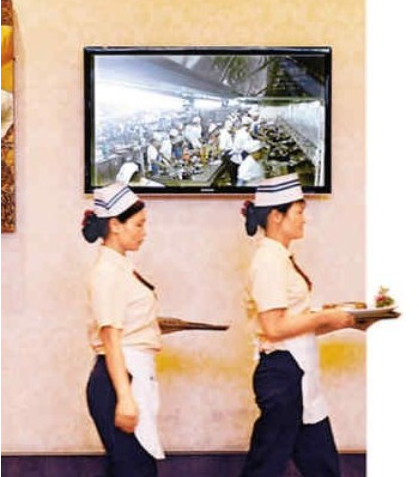 兩名服務(wù)員端著剛剛出鍋的菜肴,走過實(shí)時(shí)顯示廚房內(nèi)情景的監(jiān)控屏幕