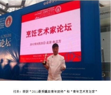 在首屆北京奧林匹克公園國際美食大賽暨第留屆東方美食烹飪藝術(shù)家國際大賽,第一場個人賽中,付洋勇奪第一名。2012年6月20日烹飪藝術(shù)家論壇,北京-水立方站頒獎典禮上,付洋榮獲“2011年最受矚目青年廚師”和“青年藝術(shù)烹飪家”。