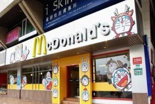 2010年2月,臺灣的麥當(dāng)勞花巨資打造了全臺20家麥當(dāng)勞哆啦A夢旗艦店。而臺北的麥當(dāng)勞則首當(dāng)其沖。這些旗艦店以機(jī)器貓(Doraemon) 12生肖版為主題,餐廳內(nèi)每個(gè)角落都可以看到哆啦A夢12生肖不同的造型和豐富的表情。從大門設(shè)計(jì)、窗貼、餐廳內(nèi)柜臺、門柱等裝潢,到餐盒包裝設(shè)計(jì)以及員工服飾等,到處都可以感受到機(jī)器貓 (Doraemon) 的存在。