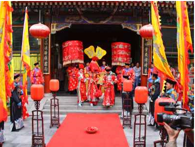 仿膳飯莊的婚宴很有中國傳統(tǒng)氛圍。新娘可以坐著八抬大轎,在眾多吹鼓手吹吹打打的簇?fù)硐,從北海公園東門進(jìn)入公園,過石橋、穿游廊再回到仿膳飯莊的大門口。新郎則將蒙著蓋頭的新娘扶下轎,在繽紛的禮花中牽著新娘邁火盆、過馬鞍,走進(jìn)雕梁畫棟、金碧輝煌的漪瀾堂大廳,舉行隆重的婚禮。飯莊還為新人準(zhǔn)備了大紅喜帳、紅地毯、香檳酒塔臺(tái)、音響等設(shè)備。如果新人有興趣,還可以租一艘龍舟,在北海水上環(huán)湖一周,寓意即將到來的新生活順風(fēng)順?biāo)?span lang="EN-US">