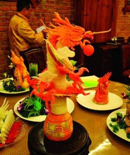 制作“中華龍”的涼菜名廚說,涼菜拼盤的制作過程,最考究的是廚師的藝術(shù)靈感和精湛、熟練的手工操作程度。自己從事廚師工作12年來,所用于練習涼菜雕刻的蘿卜、南瓜、芋頭、萵筍等果蔬已達到3萬多斤。