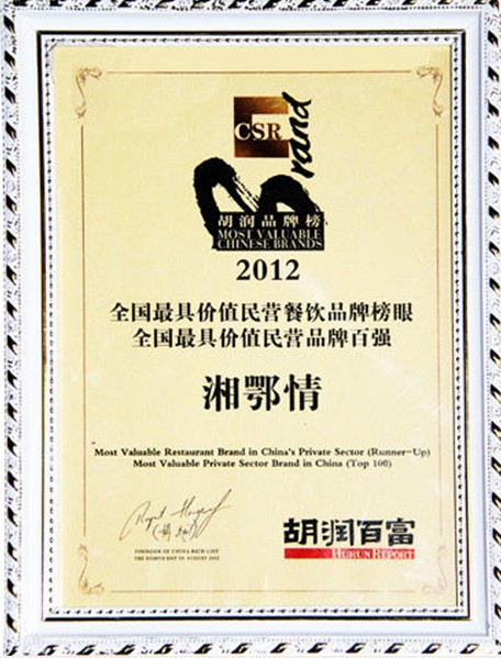 胡潤研究院近日發(fā)布《2012中國民營企業(yè)品牌排行榜》暨《2012胡潤品牌榜》,榜單對100個中國最有價(jià)值品牌按照其品牌價(jià)值進(jìn)行排名。今天記者從湘鄂情集團(tuán)獲悉,其昨天剛剛拿到2012全國最具價(jià)值民營餐飲品牌榜眼的證書。