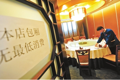 在晉陽飯莊每個包間的門上,都貼有明顯的告示牌:包間不設(shè)最低消費。晉陽飯莊公益橋分店共有14個包間,可坐6-20人不等。“包間不設(shè)置最低消費,您吃200元能坐包間、1000元也能坐包間!泵舷驏|介紹說,“之前,也很少有人只點幾個菜非指定坐包間,此次我們承諾遵守工商部門的規(guī)定不設(shè)置最低消費!