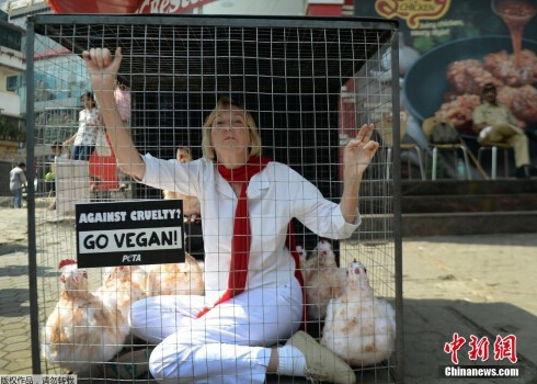 當(dāng)?shù)貢r(shí)間2014年11月6日,印度孟買,印度善待動(dòng)物組織(PETA)的成員Ingrid E. Newkirk將自己關(guān)在籠子里面,在一家肯德基外抗議其虐殺動(dòng)物的不當(dāng)行為。