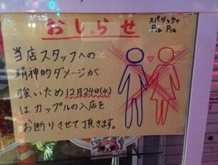 據(jù)香港《文匯報》12日報道,圣誕節(jié)本應普天同慶,但對單身人士而言,到處都是成雙成對只能覺得郁悶。日本東京八王子市意式餐廳Pia Pia考慮到在平安夜上班員工的感受,特別在門口貼告示,宣布平安夜當日謝絕情侶光顧。