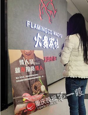 位于南岸區(qū)時(shí)代星光廣場的火舞炭燒主營炭燒、烤肉,他們打出的廣告詞是———情人節(jié),就不接待情人(如圖)。“我已經(jīng)給服務(wù)員打好招呼,遇到手挽手成雙成對的恕不接待!崩习宀虖┬,情人節(jié)不能只有耍朋友的開心了,單身的人悲傷度過。他準(zhǔn)備唱反調(diào)到底,他還會給屆時(shí)前來就餐單身人士準(zhǔn)備一份禮物。
