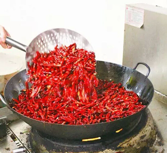 大鐵鍋上火,下大豆油50斤燒至三成熱,調(diào)成中火,陸續(xù)下入泡椒50斤,不停翻炒約半小時,與此同時將整塊的永川豆豉3斤剁成細粒(不要剁碎),至泡椒炒出香后下入剁好的豆豉再炒約15分鐘,下入泡菜丁25斤,繼續(xù)翻炒半小時,一起炒香后;。