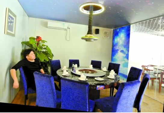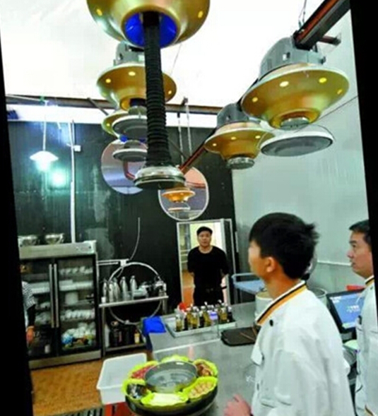 進(jìn)入餐廳,首先映入眼簾的是頭頂上灰藍(lán)的太空和耀眼的星星天幕,最奇特的是有幾只金色的飛碟吊著托盤,托盤上盛滿菜,沿著軌道在“太空”中運(yùn)轉(zhuǎn)。當(dāng)運(yùn)轉(zhuǎn)至餐桌上方,飛碟會(huì)自己停住,伸下長(zhǎng)長(zhǎng)的“腰”,將菜送至客人面前。