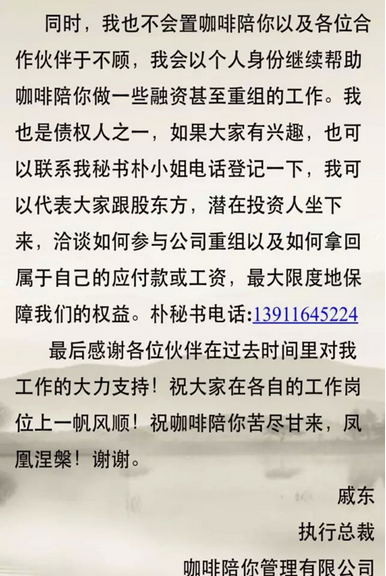今年5月25日,咖啡陪你執(zhí)行總裁突然辭職,而他本人也爆出已經(jīng)有8個月沒有領(lǐng)到薪水。也就是說,從去年8月份開始,“咖啡陪你”就已拖欠其工資。