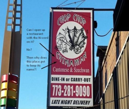 網(wǎng)友吐槽飯店名稱:“我能以N開(kāi)頭那個(gè)詞(指Nigger,黑鬼)做餐館名嗎?”、“不能”、“那這家為什么可以叫中國(guó)佬?”