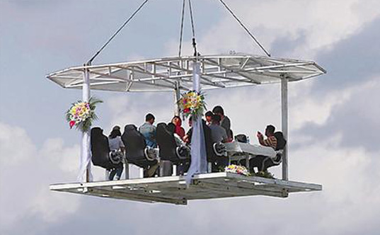 據(jù)聞,“空中餐廳”四周不設(shè)圍欄,享受餐飲服務(wù)的價格為每位8888元?吹健翱罩胁蛷d”被起重機(jī)吊著緩緩升空,不少圍觀市民嘖嘖稱奇,紛紛舉起相機(jī)、手機(jī)拍照留念,并感嘆:“這是用生命在吃飯呀!”、“這吃的不是飯,而是刺激體驗!”。