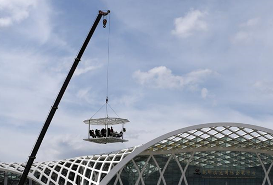 據(jù)了解,“空中餐廳”長4.5米、寬3米、高2.5米,重約3噸。加上8名顧客、1名廚師及1名服務(wù)員,重約4.5噸,由一臺重32噸、高40米的起重機(jī)吊在30米高空。