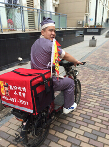 你可以想象這樣一個場景:車來車往的都市,長安街上,一個大俠裝扮的古裝小哥騎著電動車風(fēng)馳電掣,一桿杏黃旗上書“蝦鼎記”在車流中隨風(fēng)飄蕩,無數(shù)路人好奇地拿起手機(jī)拍照、發(fā)微博和朋友圈,甚至要求合影。到了客戶家:“大俠您好,我是蝦鼎記神行太!笨蛻艚舆^熱氣騰騰的海鮮,驚喜之余又接過一個骰盅、四枚骰子,點(diǎn)餐即可獲得一次搖骰子機(jī)會,四個六免單,四個六以外點(diǎn)數(shù)相加減掉相應(yīng)錢數(shù)。于是,喜上加喜。