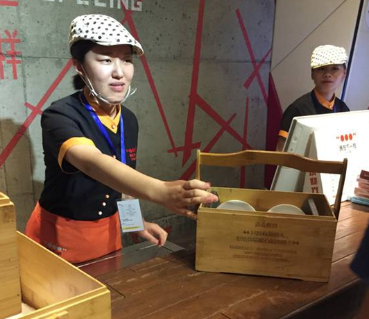 這個(gè)桌子已經(jīng)成為了“食在不一樣”的獨(dú)門利器,自帶抽屜,這樣當(dāng)顧客離店要打包的時(shí)候可以自行去解決,而且對(duì)于顧客來說中途來朋友了,餐具都是消毒的直接可以拿來用,全程不需要服務(wù)員。
