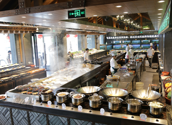 第一家店開了之后,生意很好,驗證了之前他對市場的分析。又經(jīng)過一番準(zhǔn)備,2014年,江南大院的土菜文化博物館的大院模式出現(xiàn)了,江南大院的第二家店,面積逾4000平米。這家店在體量上滿足了江南大院對于土菜展現(xiàn)的要求,門口600多平米的明檔,更讓消費(fèi)者更直接體驗到土菜的氣氛。