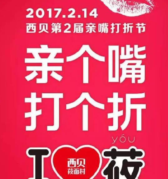 西貝2017年2月14日情人節(jié)的活動宣傳海報(bào)主題——親個(gè)嘴,打個(gè)折。
