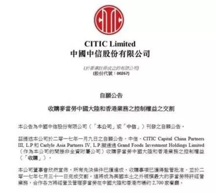 根據(jù)此前麥當(dāng)勞公布的協(xié)議,中信集團旗下的中信股份、中信資本控股、凱雷投資集團和麥當(dāng)勞聯(lián)合宣布達成戰(zhàn)略合作并成立新公司,新公司將以最高20.8億美元的總對價收購麥當(dāng)勞在中國內(nèi)地和香港的業(yè)務(wù)。中信集團旗下中信股份和中信資本在新公司中將持有共52%的控股權(quán),凱雷和麥當(dāng)勞分別持有28%和20%的股權(quán)。