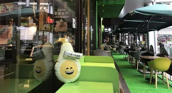 從門店的布置,就能看得出樂凱撒對新產(chǎn)品的發(fā)力攻勢:整家店都被綠色包圍,墻壁、地板和餐桌布都是綠色;店里到處都是牛油果貼紙,表情還是不一樣的;在這家店,消費者還可以品嘗到最新的牛油果系列產(chǎn)品。