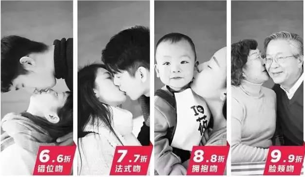 “西貝”為“親嘴打折節(jié)”準(zhǔn)備了一個(gè)極其吸引眼球的廣告語(yǔ)“吻得越深,折扣越大”,并設(shè)計(jì)了四種不同的親吻姿勢(shì)和對(duì)應(yīng)折扣。別出心裁的打折方式,給了中國(guó)人一次公開高調(diào)秀恩愛(ài)的機(jī)會(huì)!