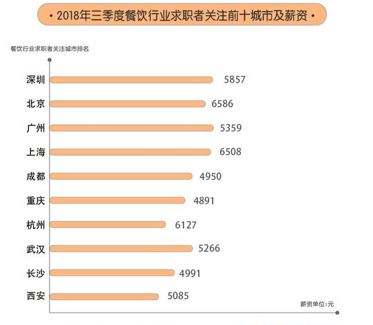 58同城的報(bào)告則顯示,2018年第三季度餐飲業(yè)求職者關(guān)注的前十城市分別為深圳、北京、廣州、上海、成都、重慶、杭州、武漢、長沙、西安,北上廣深四大一線城市成為最受歡迎的城市。