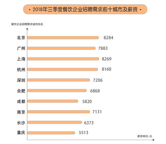 這份報(bào)告的數(shù)據(jù)來看,今年第三季度餐飲企業(yè)招聘需求量前十城市依次為北京、廣州、上海、杭州、深圳、合肥、成都、南京、長沙、重慶,北上廣包攬了餐飲企業(yè)招聘需求量的前三名。
