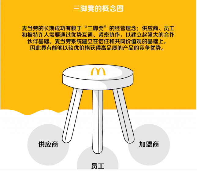 在麥當(dāng)勞著名的“三腳凳”文化中,供應(yīng)商、被特許人和麥當(dāng)勞被視為缺一不可的組成部分,三者在共同的價(jià)值觀下,優(yōu)勢互通、緊密協(xié)作。